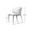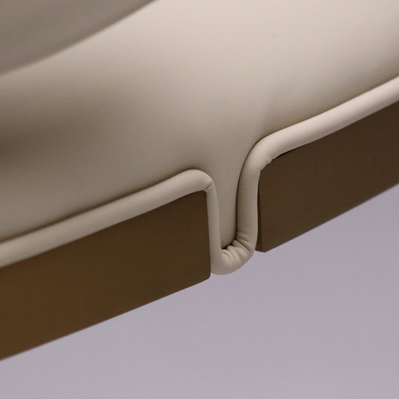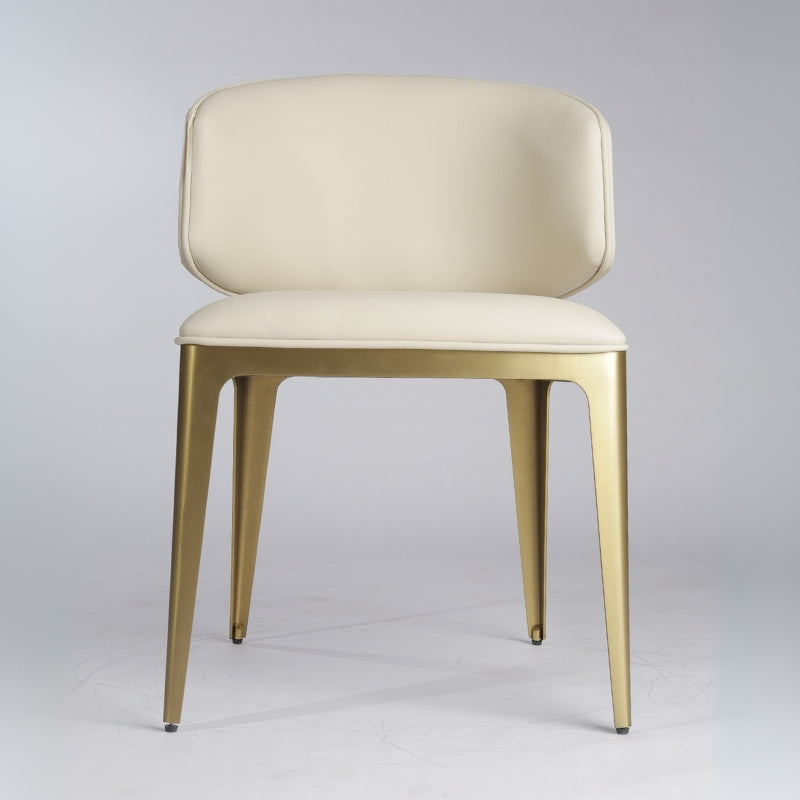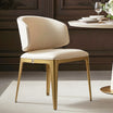 This chair contrasts a light, smooth backrest and a soft upholstered seat with a solid, metallic-finish frame. Its unique style works beautifully with glass, metal, or dark wood dining tables, making it very versatile.